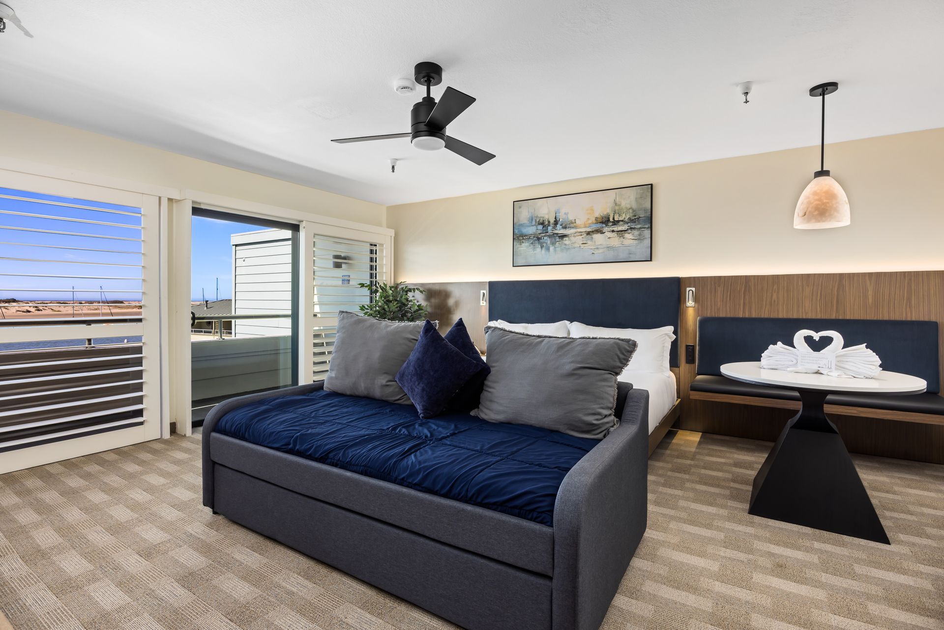 Relax on your private balcony overlooking Morro Bay's harbor in this spacious superior (full view) suite with a (Non-Smoking 1 King Bed) guest room and a well-appointed living room with full-size sofa sleeper. The suite has a wet bar and all of the amenities to keep you comfortable including a gas fireplace in living room, in-room coffee, free Wi-Fi, HBO, Cable TVs, a flat screen TV, microwave, mini-refrigerator, hairdryer, robes, yoga mat and an iron and ironing board for your convenience. The Embarcadero inn features free covered parking and secured elevator access to all rooms.