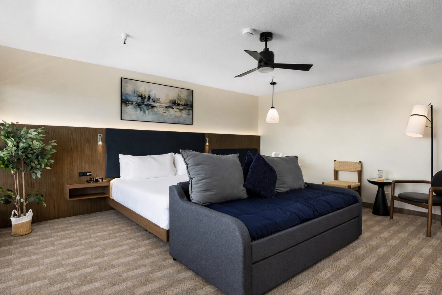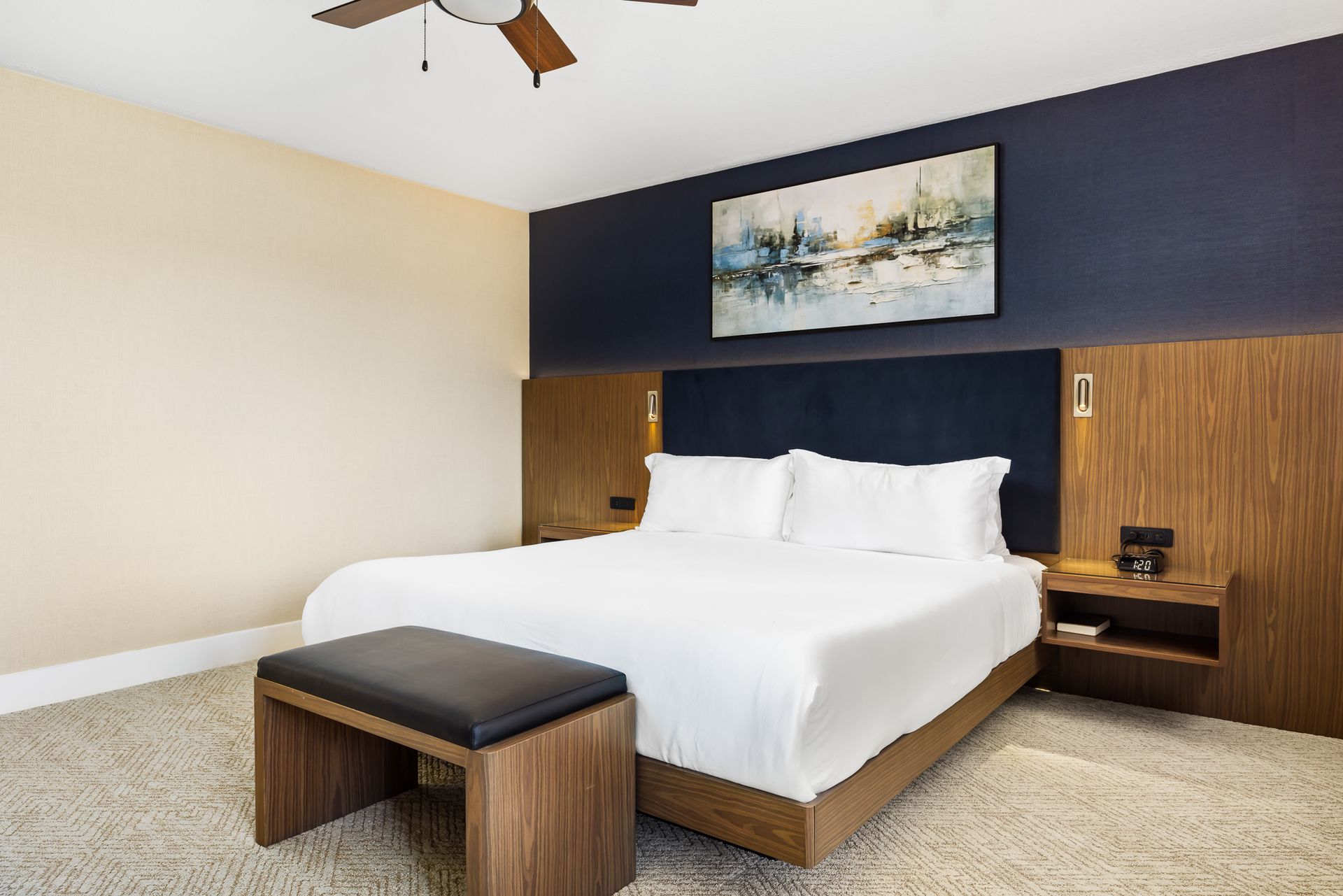 Newly renovated with modern, sleek furnishings, this spacious non-smoking room features one plush king bed and full panoramic views of the scenic Embarcadero Bay. Enjoy upgraded comforts including a refreshed bathroom with new tile, a walk-in shower, LED vanity mirror, and brand-new carpet (hardwood flooring in our pet-friendly rooms). Room also includes: in-room coffee, free Wi-Fi, Cable TV on a flat-screen, hair dryer, robes, yoga mat and an iron and ironing board for your convenience. The Embarcadero Inn features free covered parking and secured elevator access to all rooms.