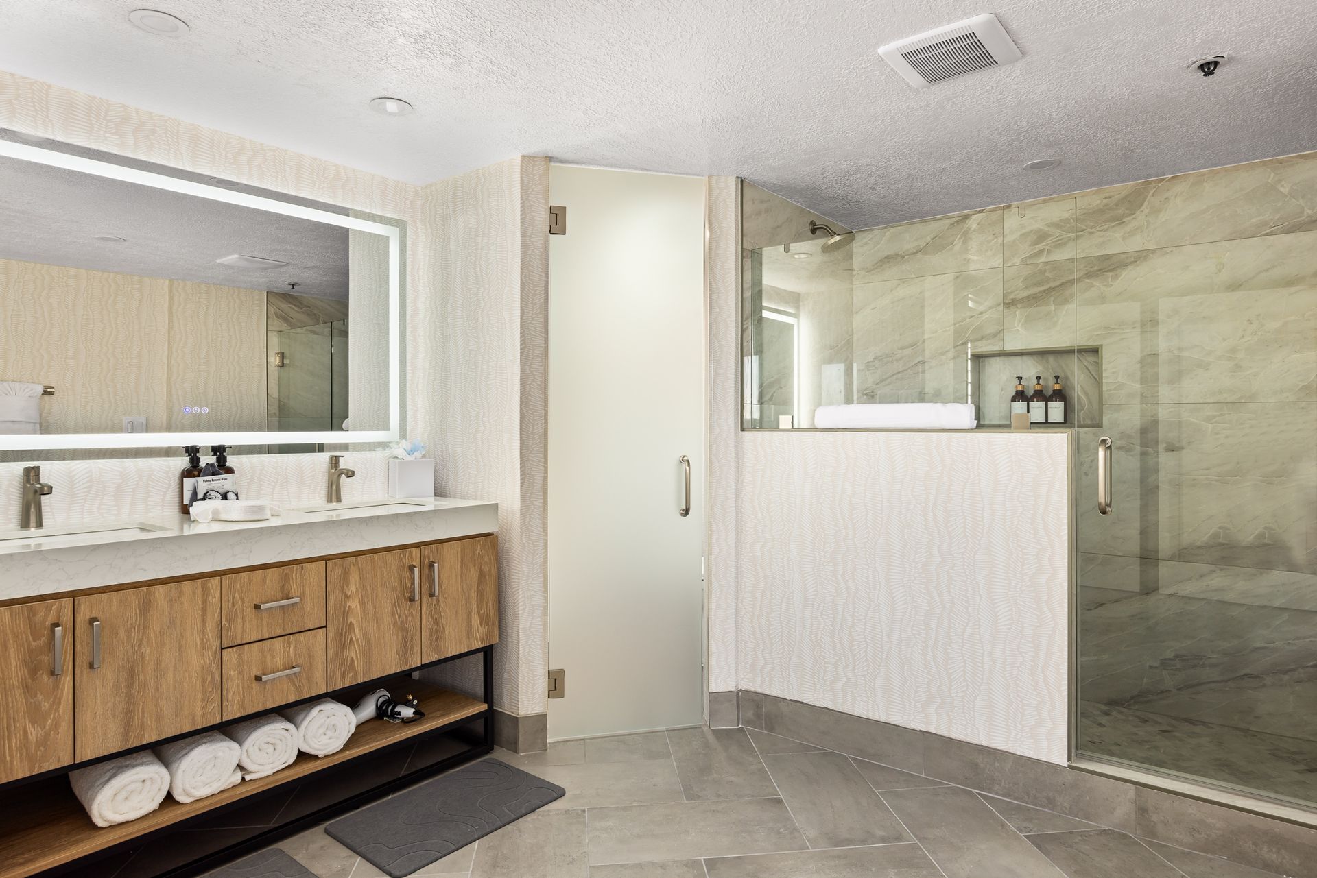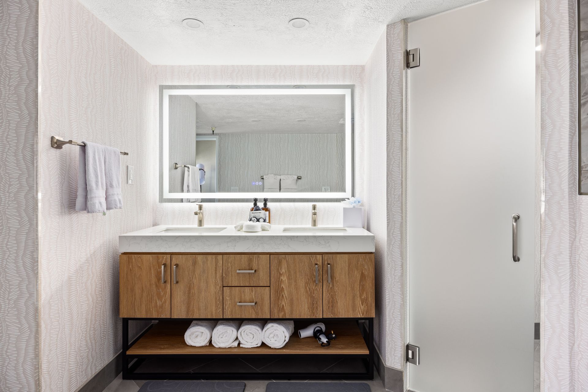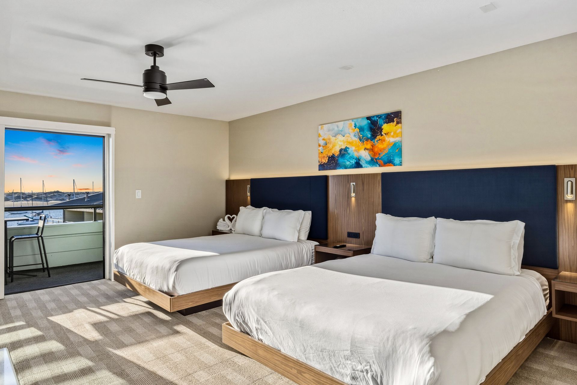Newly renovated with modern, sleek furnishings, this spacious non-smoking room features 2 queen beds and full panoramic views of the scenic Embarcadero Bay. Enjoy upgraded comforts including a refreshed bathroom with new tile, a walk-in shower, LED vanity mirror, and brand-new carpet (hardwood flooring in our pet-friendly rooms). Room also includes: in-room coffee, free Wi-Fi, Cable TV on a flat-screen, hair dryer, robes, yoga mat and an iron and ironing board for your convenience. The Embarcadero Inn features free covered parking and secured elevator access to all rooms.